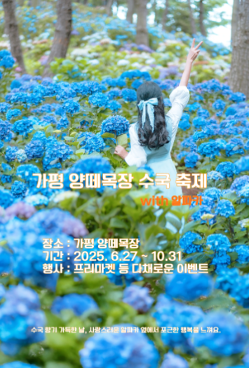 2025년 여름부터 가을까지, 수국이 만개하는 가평 양떼목장에서 감성 가득한 하루를 보내보세요. 자연과 꽃, 동물들이 어우러진 축제 속에서 소중한 사람들과의 추억을 만들어 보시길 바랍니다. 입장료도 무료이니 꼭 한 번 들러보시길 추천드립니다!