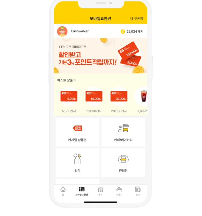 캐시워크 | 걸음 수 따라 포인트 적립 | 커피, 편의점 쿠폰 등 |