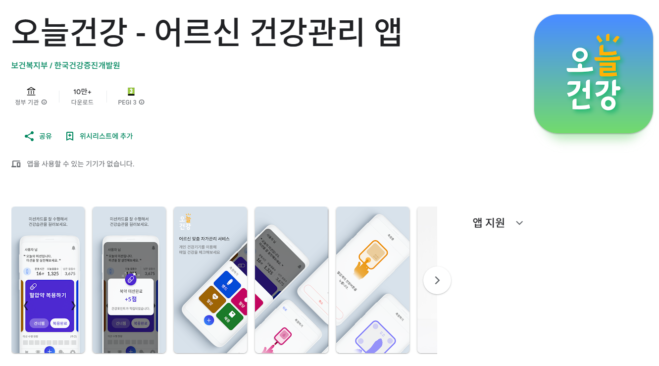 | 설치 방법 | 구글 플레이스토어 또는 앱스토어에서 ‘오늘건강’ 검색 후 설치 |