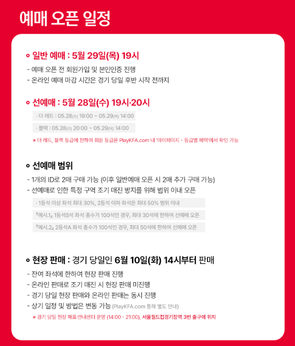 - 선예매는 PlayKFA 더 레드, 블랙 등급에 한하여(등급은 PlayKFA.com 내 마이페이지에서 확인 가능)