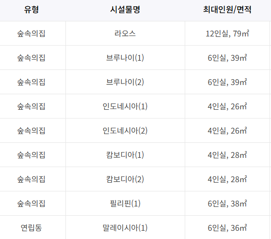 - 숙소: 숲속의 집(9실), 연립동(15실)