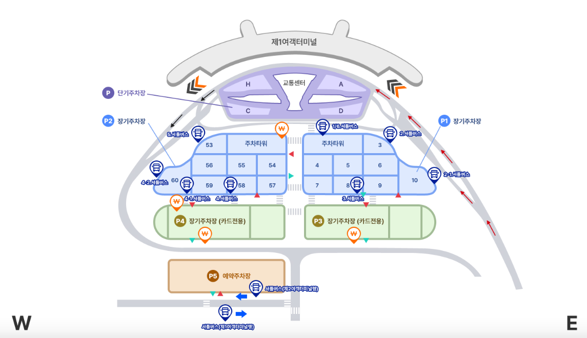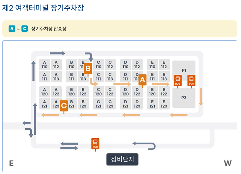 여객터미널과 가까운 곳을 원한다면 예약 가능한 장기주차장 B(제1터미널) 또는 D(제2터미널)를 이용하는 것이 좋습니다. 수하물이 많거나 아이가 있다면 터미널까지 도보가 짧은 구역을 선택하세요. 장기주차장 내부에서도 주차 공간에 따라 셔틀버스 탑승 여부가 달라질 수 있습니다.