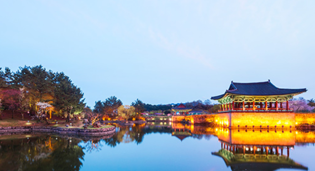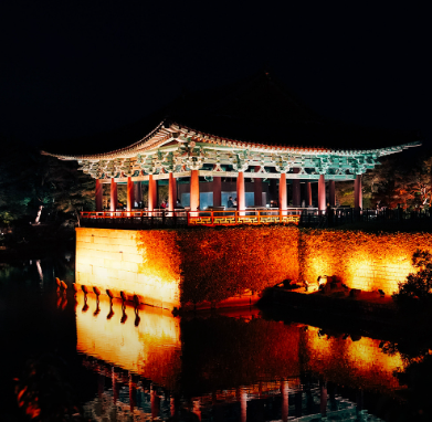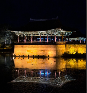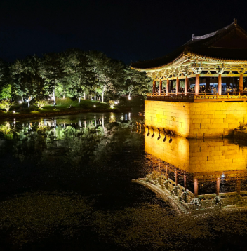 동궁과 월지는 과거 '안압지'라 불리던 곳으로, 신라 왕족의 연회와 외교 장소로 사용되던 별궁입니다. 낮에도 고즈넉한 매력을 뽐내지만, 특히 밤에는 조명이 켜지며 물 위에 비친 월지의 반영이 장관을 이루어 경주 야경 1순위로 꼽힙니다.