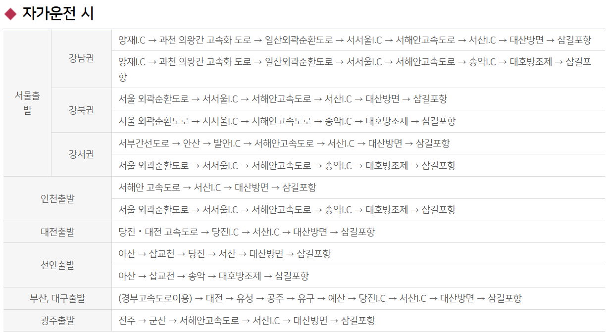 - 경부고속도로 → 서해안고속도로 → 해미 IC → 삼길포항