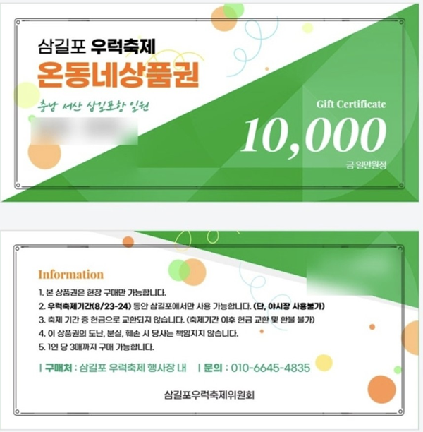 2024년부터 진행된 삼길포 상품권으로 삼길포 온동네 상품권은 삼길포 관광객들이 본 상품권 10,000원(만원) 을 구매하면, 축제 위원회에서 2,000원을 보조해드리고 있습니다.