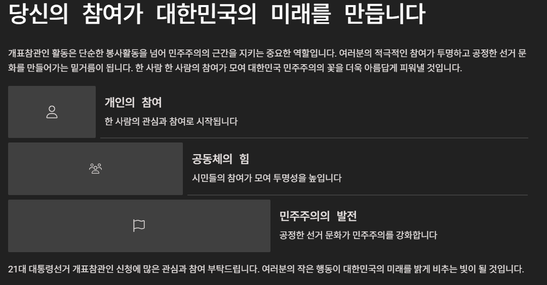 대한민국의 미래를 결정할 중요한 선택, 21대 대통령선거가 다가오고 있습니다. 민주주의의 꽃이라 불리는 선거 과정에 직접 참여하고 투명한 선거 문화를 만들어가는 뜻깊은 경험을 하고 싶으신가요?