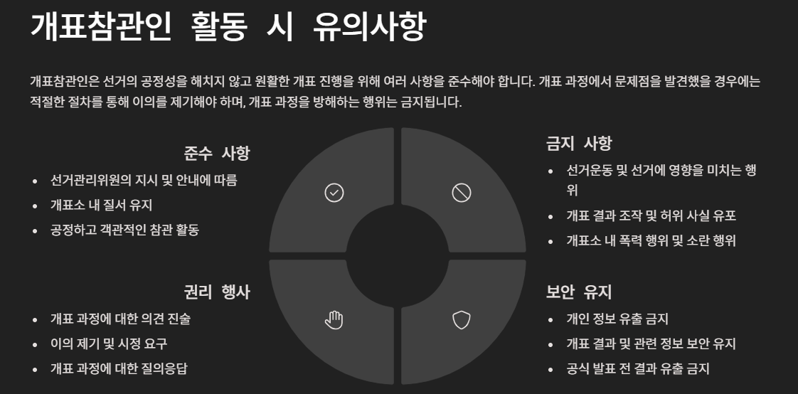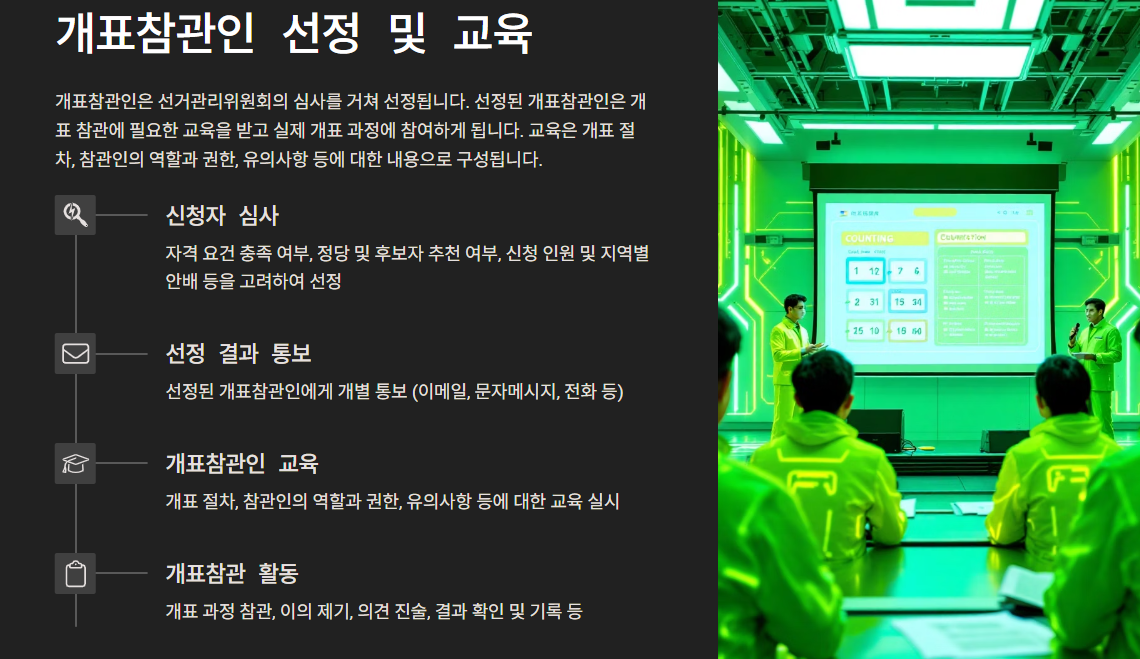 - 개표참관인 교육: 개표 절차, 참관인의 역할과 권한, 유의사항 등에 대한 교육 실시