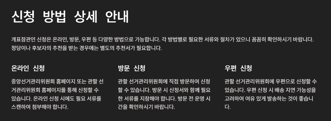 - 온라인, 방문, 우편 등 다양한 방법으로 관할 선거관리위원회에 신청할 수 있습니다.